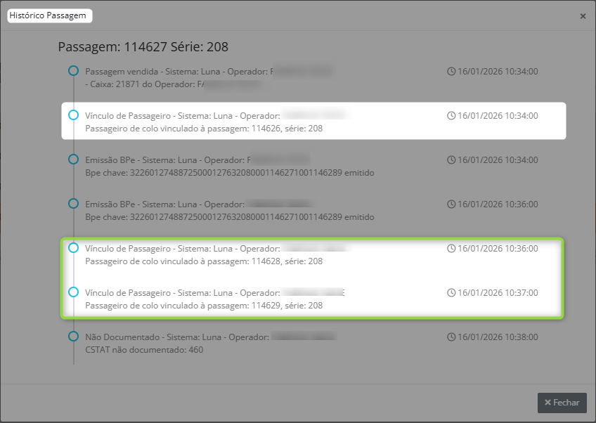 Consulta ao histórico de vínculo entre responsável e criança de colo. Registro completo de vínculo e histórico de transferência para passageiro de colo. Implementação dos dados de vinculo de substituições - Transferências |
