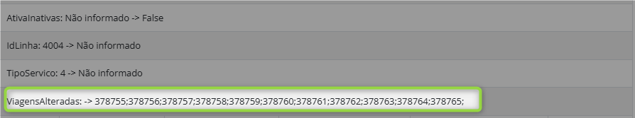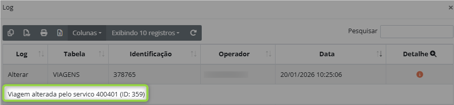 Registro de log para viagens alteradas pela rotina de serviço. |