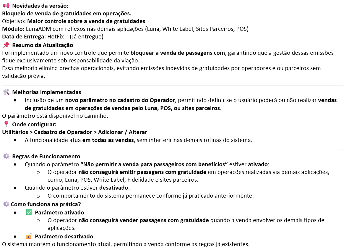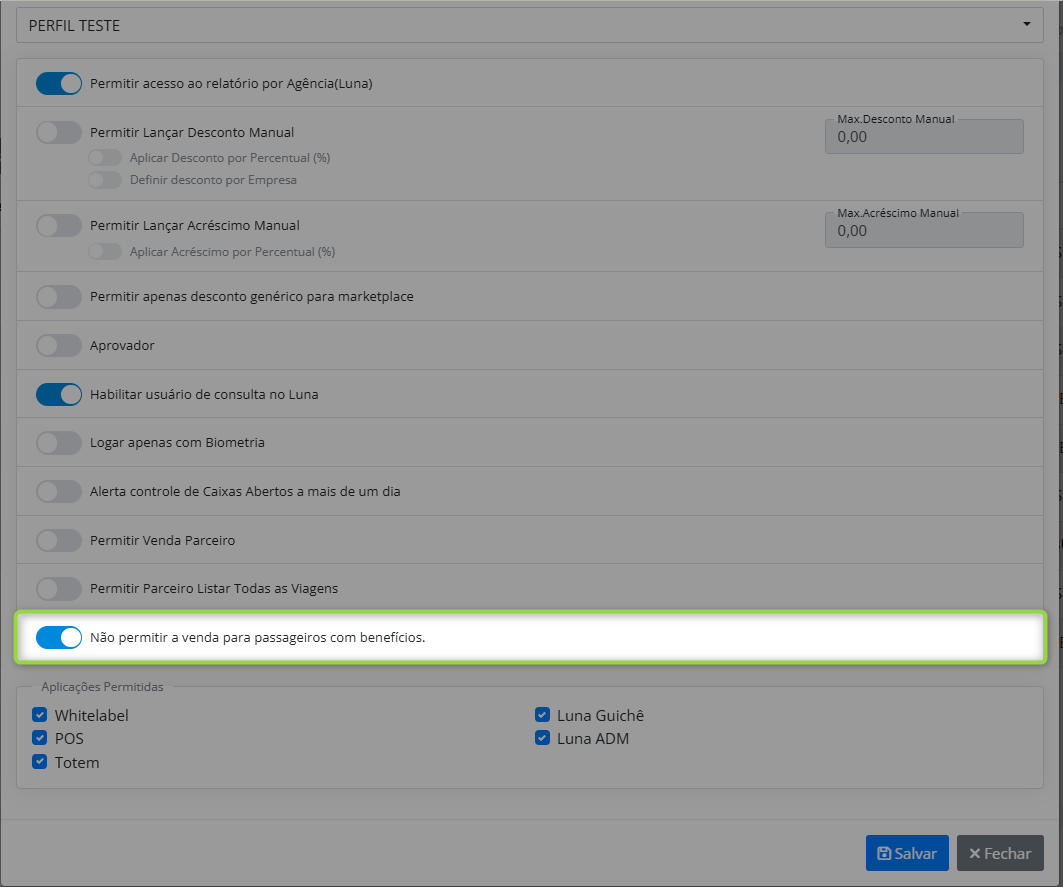 Luna ADM [Caminho]: Utilitários > Cadastro de Operador > Adicionar / Alterar > "Não permitir a venda para passageiros com benefícios" |