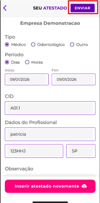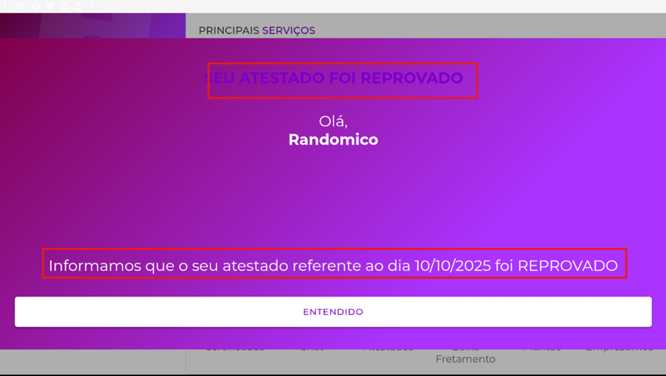Obs: Os atestados que forem reprovados, ao clicar em "Entendido", o atestado irá permanecer na relação dos atestados lançados e o colaborador poderá reenviar ele para analisar do RH.