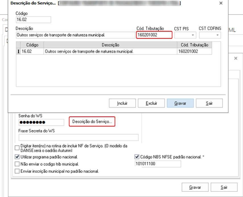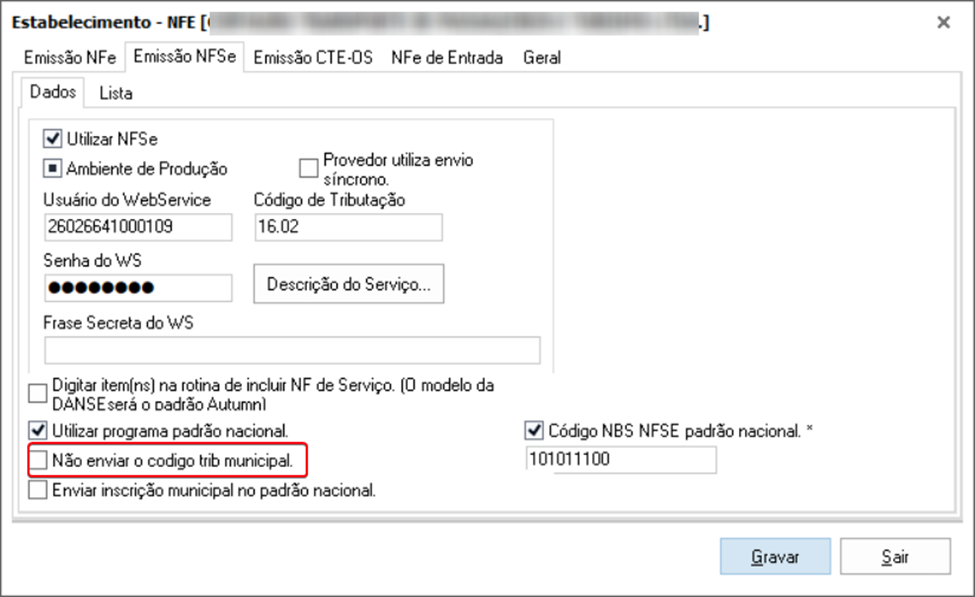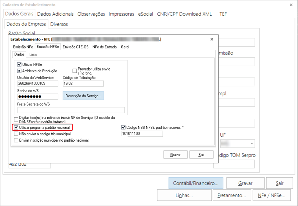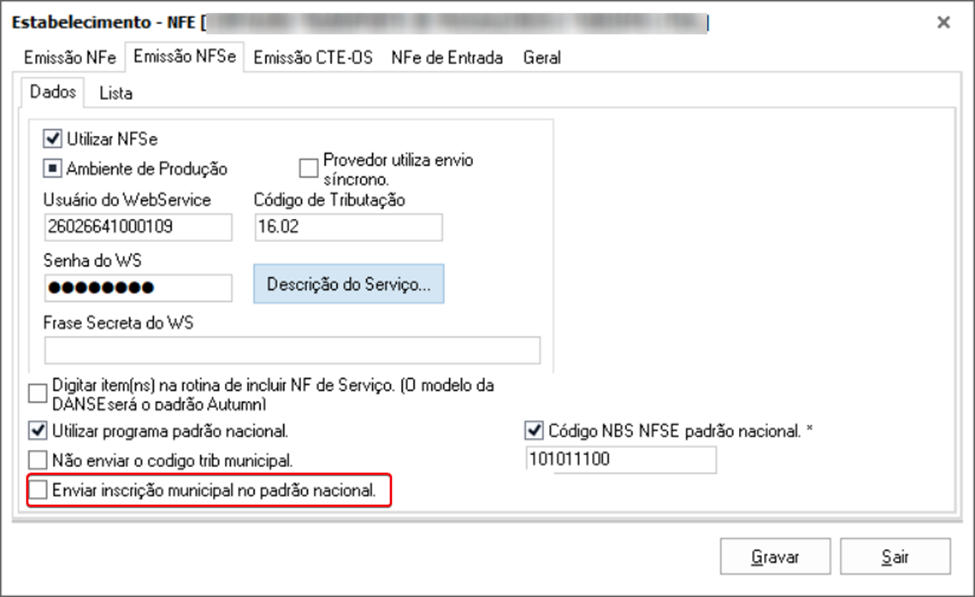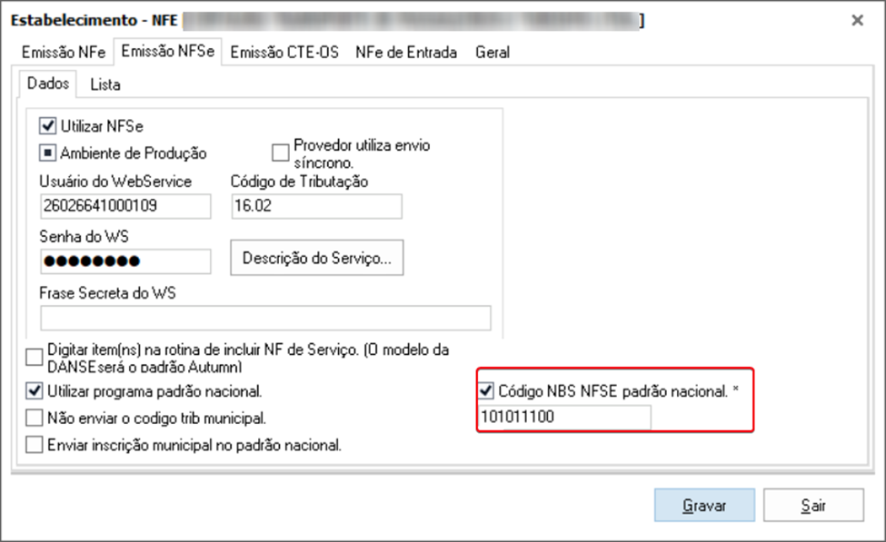 Utilitários ➪ Dados da Empresa ➪ Estabelecimento ➪ NFSe ➪ Emissão NFSe: ‘Código NBS NFSE padrão nacional’