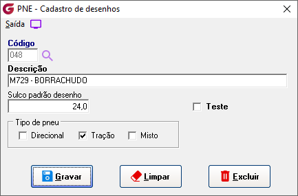 Cadastros> Desenhos Informe um código de 03 dígitos, uma descrição de até 40 caracteres, informe o sulco e o tipo de pneu entre as opções "Direcional", "Tração" ou "Misto". |
