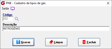 Cadastros> Tipos de gás Informe um código numérico de até 03 dígitos e uma descrição de até 40 caracteres.