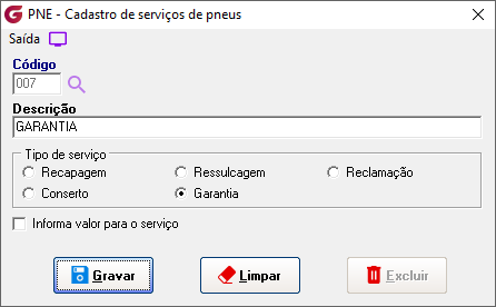 Cadastros> Serviços de pneus Informe um código numérico de até 03 dígitos e uma descrição de até 40 caracteres. Defina um tipo de serviço. Informa valor para o serviço. Deixe essa opção desmarcada para serviços sem custos.