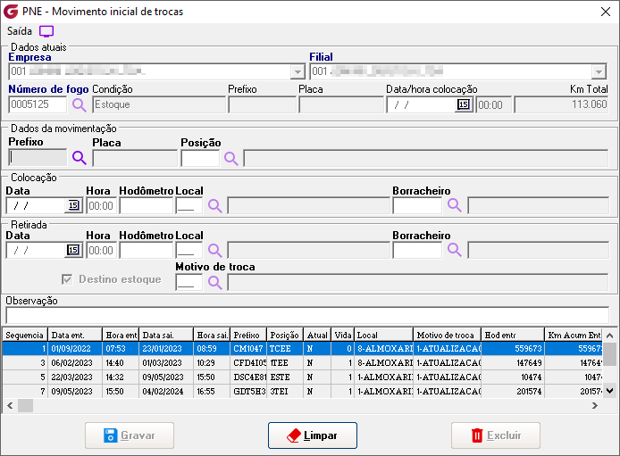 Módulo: Pneus (PNE) Caminho de acesso: >Cadastros> Atualização inicial> Movimento de trocas |