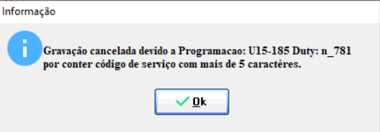 A integração vai validar o tamanho do campo de serviço no Globus (limitado a 5 caracteres) emitindo a mensagem a seguir caso tenha alguma informação fora do padrão.