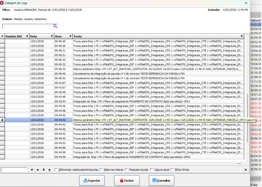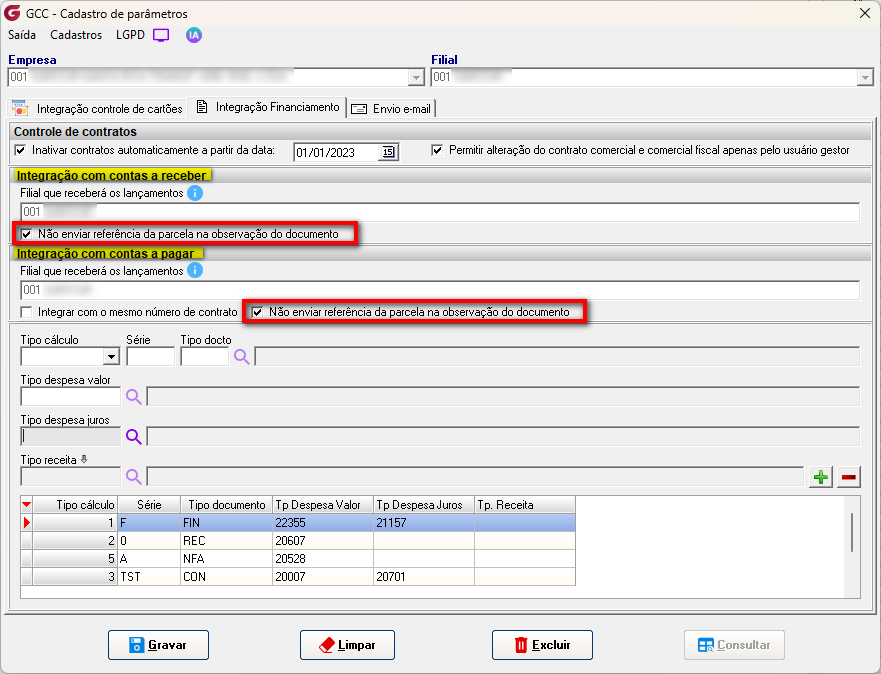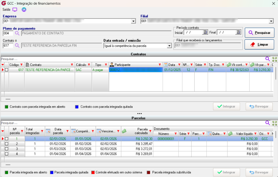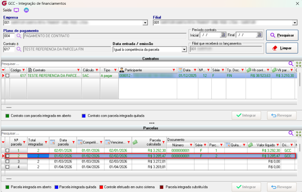 Integraremos a segunda parcela do contrato 617. Como a validação é feita no momento da integração, cada parcela poderá ter ou não a referência nas observações, de acordo com o que foi selecionado nos parâmetros.