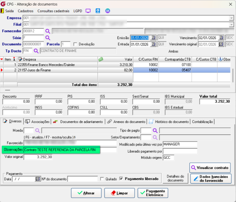 Nas observações do documento consta apenas o nome do contrato integrado.