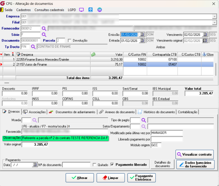 Utilizaremos como exemplo a integração de um contrato SAC para o Contas a Pagar.