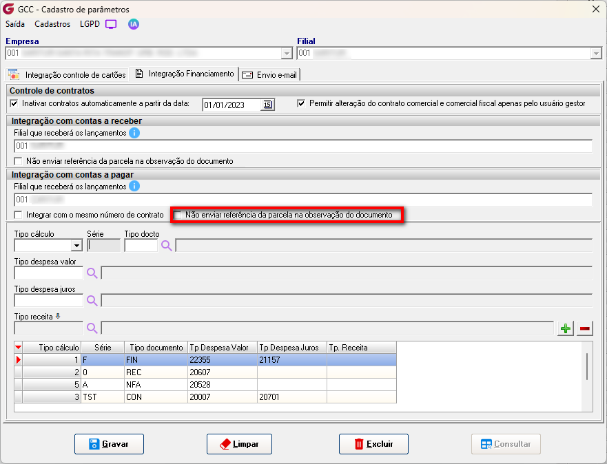 Adicionada opção chamada "Não enviar referência da parcela na observação do documento" no cadastro de parâmetros, aba "Integração Financiamento". Quando essa opção estiver marcada, na integração de contratos para o Contas a Pagar ou Contas a Receber, o texto com a referência da parcela integrada não será exibido no campo "Observações" da tela de Alteração de Documentos.