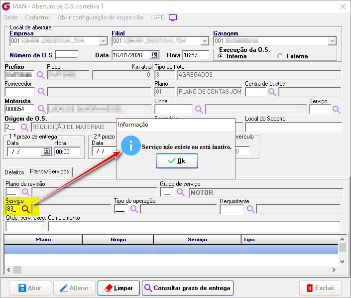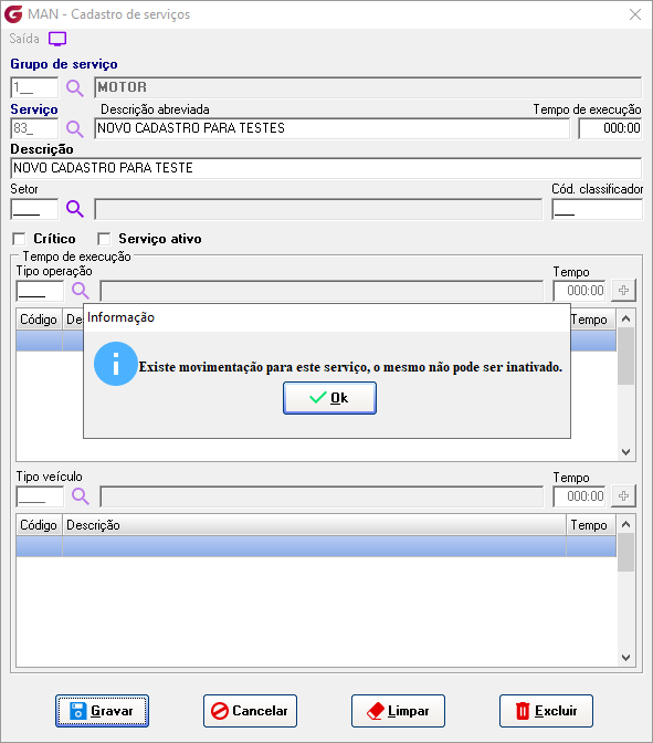 Para desativar um serviço, é necessário que não esteja associado a nenhuma ordem de serviço aberta.