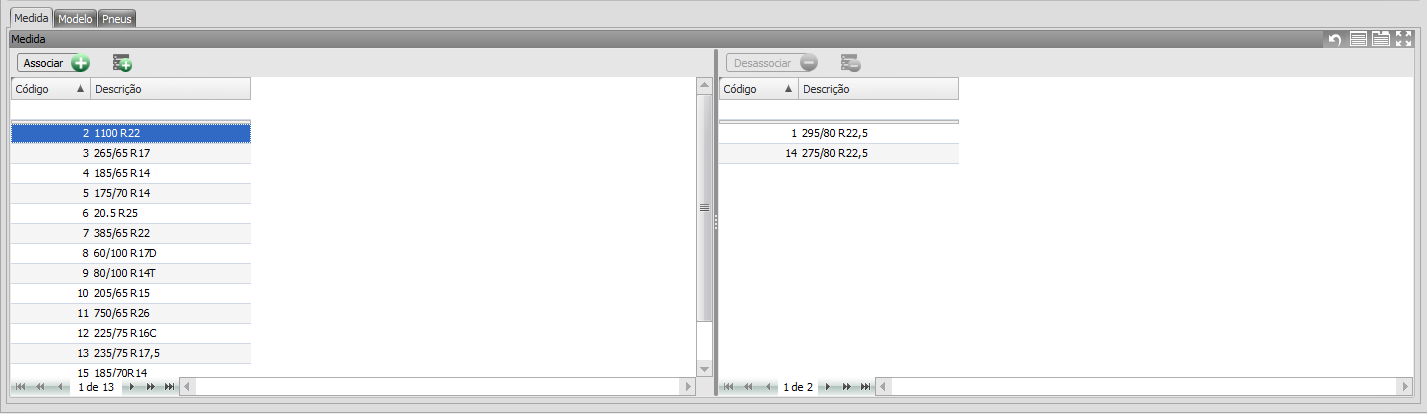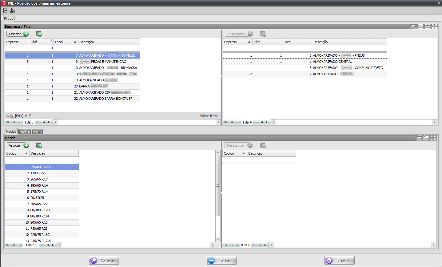 Relatórios> Posição dos pneus em estoque ![]() No grid superior esquerdo defina um filtro por empresa/filial/local Selecione empresa/filial/local desejado e clique em associar, os locais selecionados serão apresentados no grid superior direito. ![]() No grid inferior esquerdo , clique na aba medida Selecione as medidas que deseja e clique em associar, as medias selecionadas serão apresentadas no grid inferior direito. Na aba modelo Selecione os modelos que deseja e clique em associar, os modelos selecionados serão apresentados no grid inferior direito.