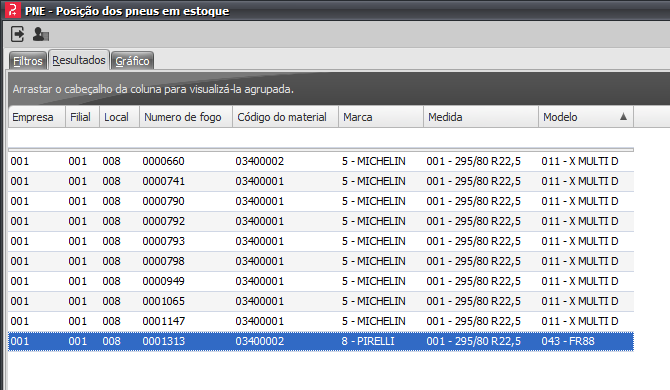 Clique no botão consultar São apresentados: empresa, filial, local número de fogo, marca, medida e modelo dos pneus em estoque