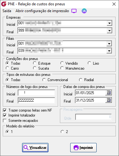 Empresas | Inicial/Final - Informe as empresas para consulta Filiais | Inicial/Final - Informe as filiais para consulta Condições dos pneus - Filtre de acordo com a condição atual dos pneus ou clique em todas Tipos de estruturas dos pneus - Filtre por estrutura convencial ou radial ou clique em todas Números de fogo dos pneus - Informe uma sequência de números de fogo ou clique com a tecla enter nos dois campos para consultar todos. Datas de compra dos pneus - Informe um intervalo de datas de compra Trazer compras feitas sem NF - Marque essa opção para consultar compras sem nota fiscal associada Imprimir totalizador - Marque essa opçao para visualizar um totalizador Somente recapados - Marque essa opção para consultar apenas apenas pneus que já foram recapados Recapagens - Com a opçao somente recapados é dada uma opção para definir consulta de acordo com a quantidade de recapagens realizadas dentro do intervalo da consulta