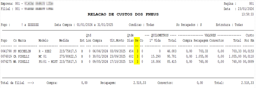 Fogo - Número de fogo Co - Abreviação da condição ES - em estoque / CA - no carro / SU - sucata / VE - vendido / MA - em manutenção / LI - lixo Marca - Descrição da marca Modelo - Descrição do modelo Medida - Descrição da medida Est - Abreviação da estrutura R - Radial / C - Convencional Lon - Quantidade de lonas Compra - Data do lançamento da compra Ult. Movto - Data do último movimento Qtde Dias - Quantidade de dias entre a data de compra e a última movimentação Re - Quantidade recapagens dentro do intervalo da consulta Co - Quantidade de consertos dentro do intervalo da consulta Quilometros | 1ª Vida / Total - Quantidade de quilometros na 1ª vida e no total Valores | Compra / Recapagem / Consertos / Total - Valor da compra, das recapagens e dos consertos e total Custos por Km - Valot total dividido pelo total de quilômetros. No modelo 2 há a inclusão do campo prefixo e retirada dos campos de esturuta e quantidade de lonas