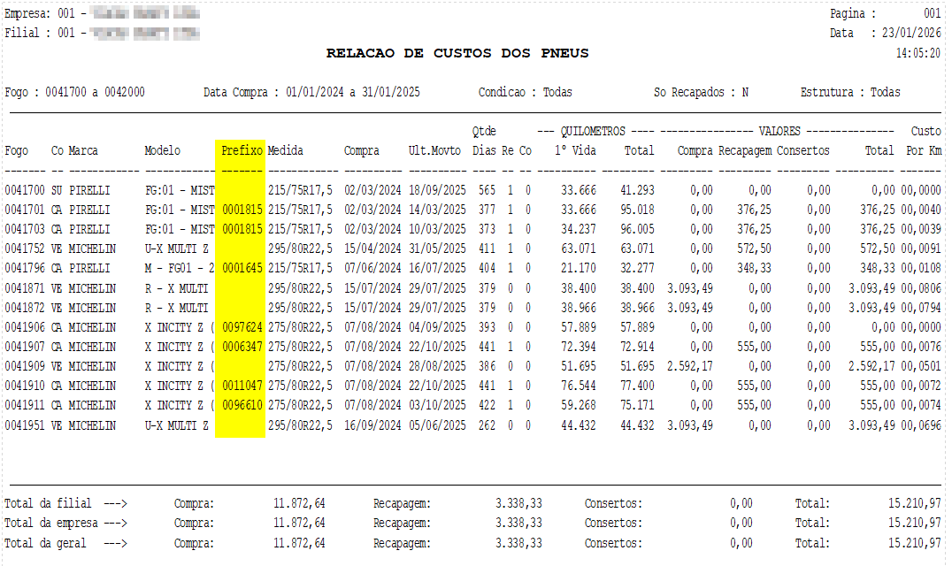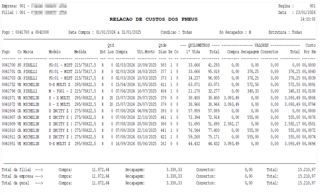 Módulo: Pneus (PNE) Caminho de acesso: >Relatórios> Relação de custos dos pneus |