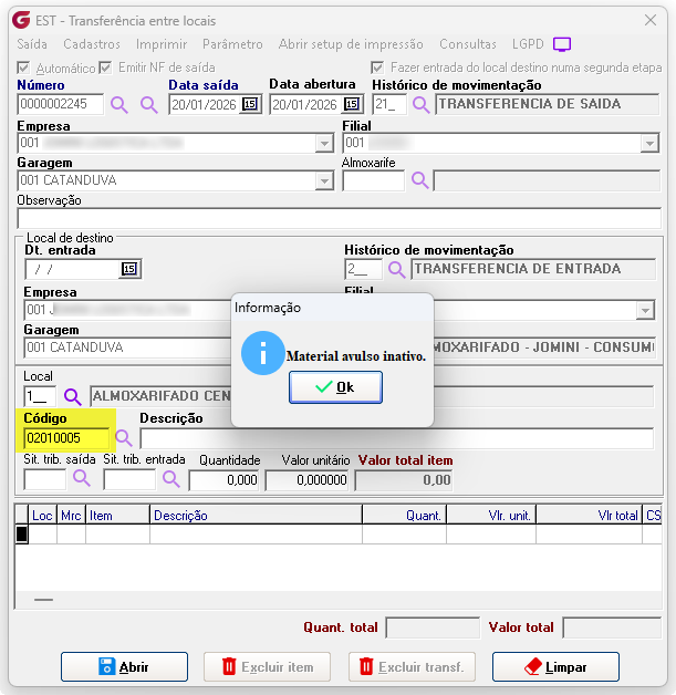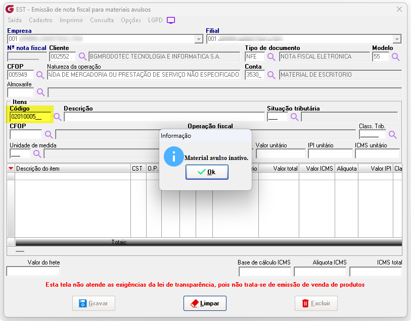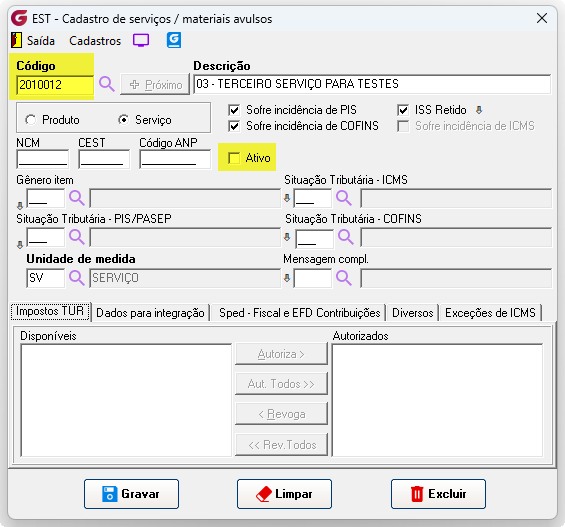 Para desativar o serviço / material avulso desmarque a opção "Ativo". Com essa opção desmarcada, o serviço/material fica desabilitado para movimentações. Entrada por nota fiscal