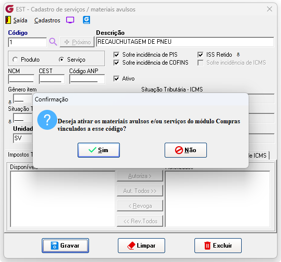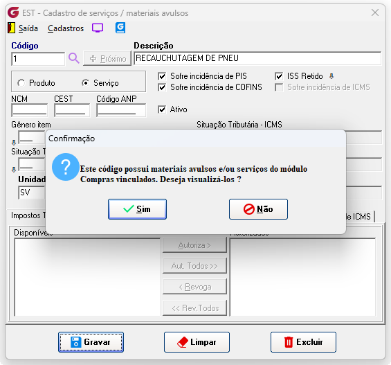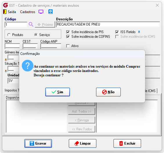 Clicando em sim, são todos inativados, clicando não, processo é cancelado. Ao ativar um serviço/material avulso, é solicitada confirmação para visualizar o serviços/materiais avulsos do compras vinculados.