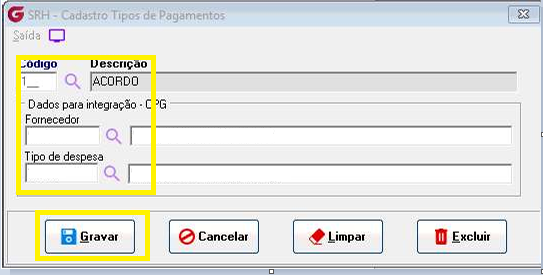 Essa etapa é essencial para que a integração funcione corretamente nas etapas seguintes. ![]() 2. CRIAÇÃO DOS TIPOS DE PAGAMENTO Criar os tipos de Pagamento com fornecedor e Tipo de Despesa. Caminho: Jurídico > Processos > Tipos de Pagamento. Com fornecedor e tipo de Despesa. Caminho: Jurídico > Processos > Tipos de Pagamento. 1. Criar os Tipos de Pagamento que serão utilizados nos processos. 2. Para cada tipo, informar:
