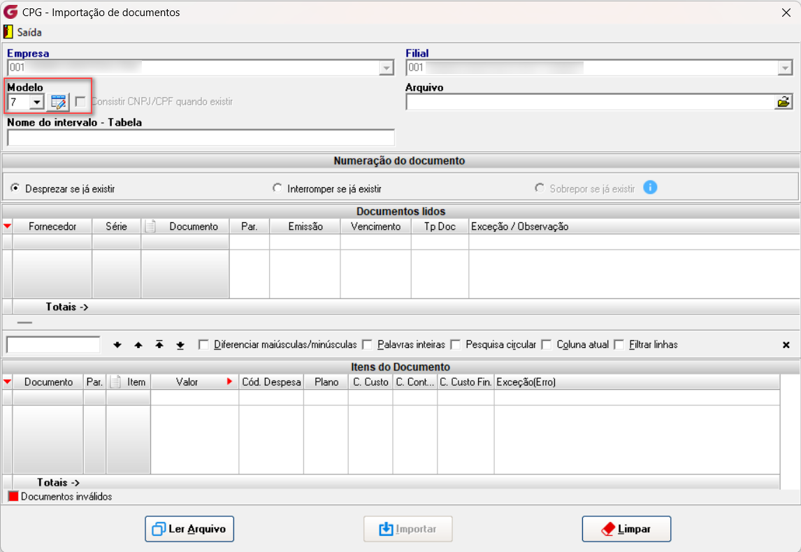 - o documento não será importado