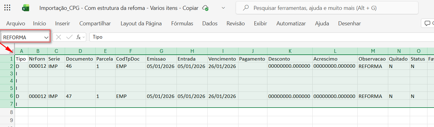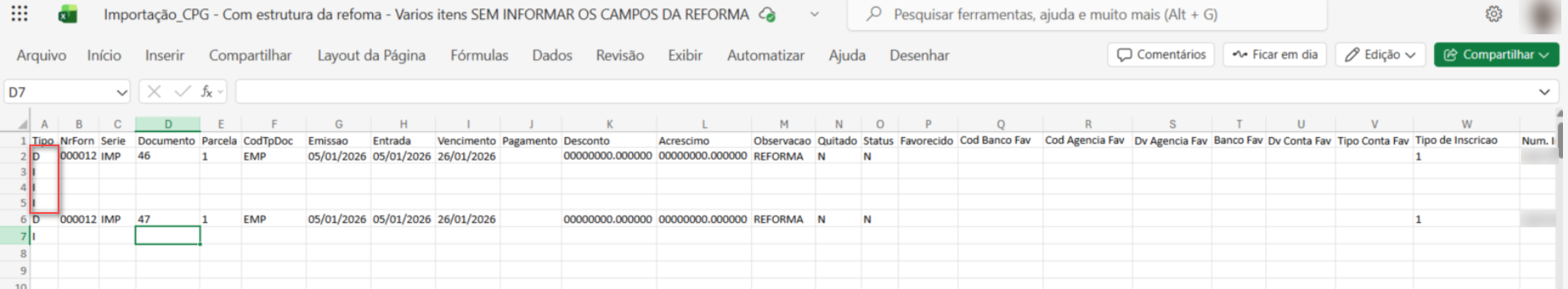 - Sem preenchimento dos campos da Reforma: Quando nenhum campo da Reforma Tributária estiver preenchido, nem na capa do documento (linha D) nem nos itens (linha I), o documento será importado normalmente, sem qualquer validação adicional.