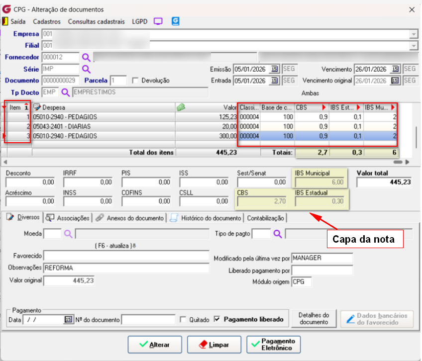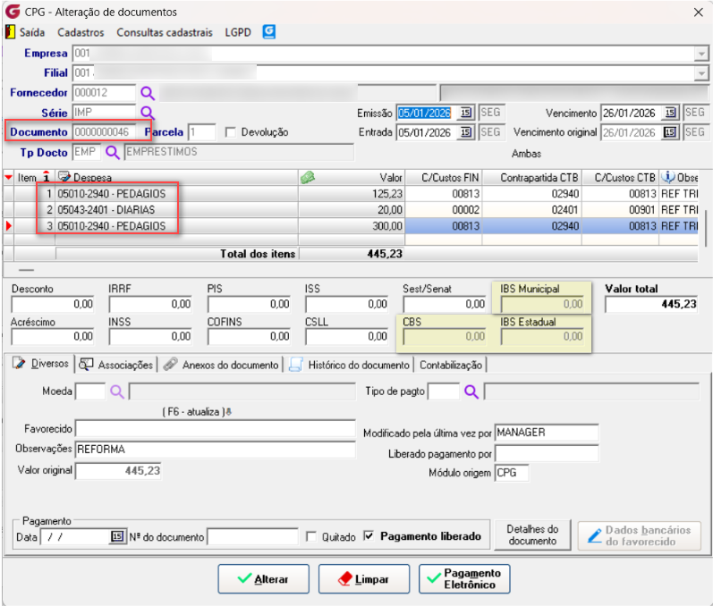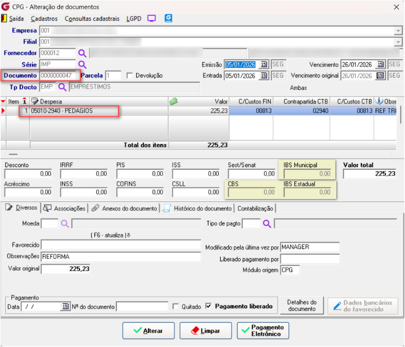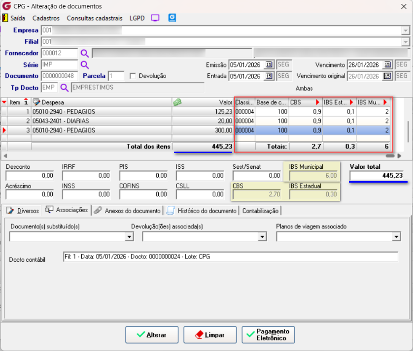 - os valores apurados serão carregados automaticamente na capa do documento.