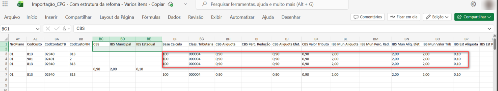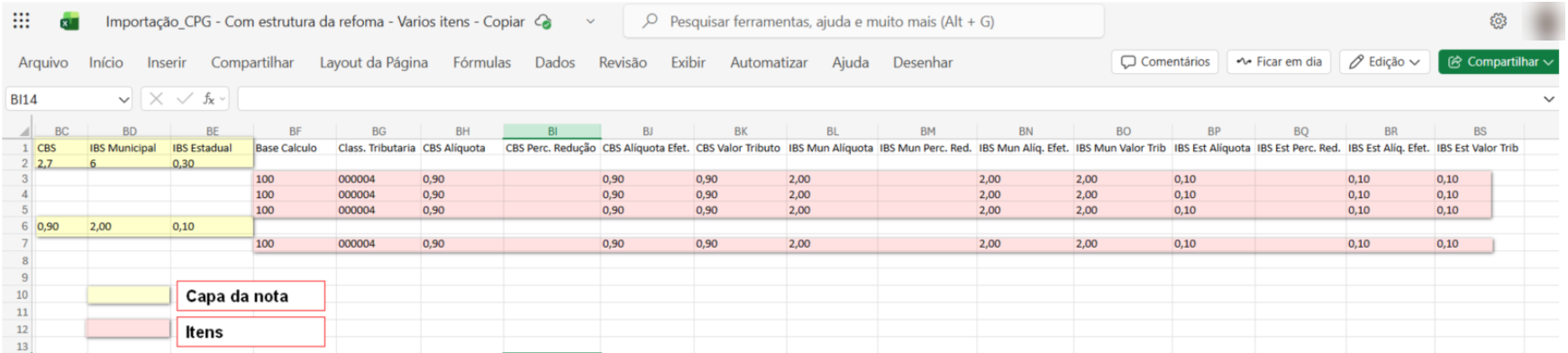 Na linha correspondente aos itens do documento, devem ser informados os campos de tributos, garantindo que cada item seja importado com seus respectivos dados fiscais.
