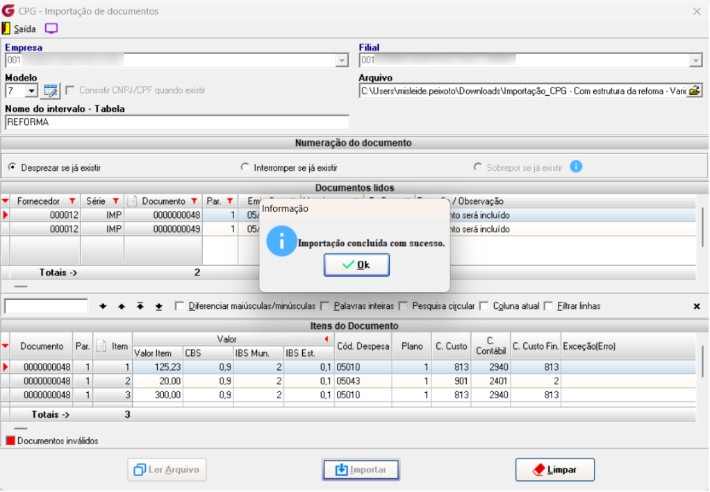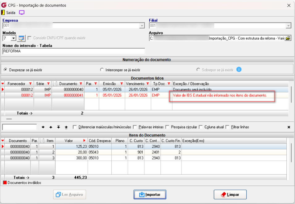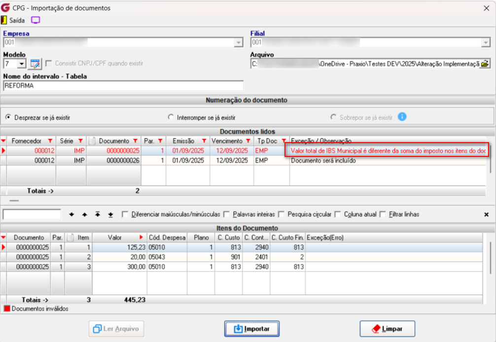 Nesse cenário ao importar sem ajustar o arquivo, apenas o documento inválido não será importado