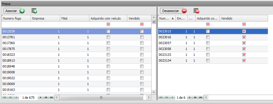 No grid Pneus, selecione os pneus e clique em associar , ou clique no botão ao lado para selecionar todos.