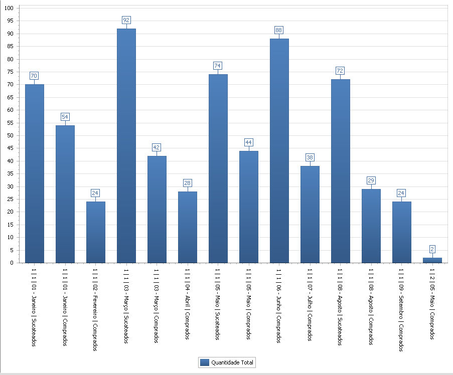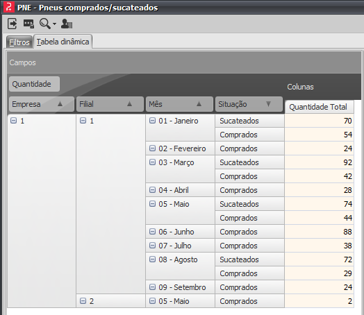 É aberta uma tabela dinâmica com os dados ordenados em linhas e colunas que podem ser modificadas. Na tabela são apresentadas as quantidades de pneus comprados e sucateados no ano.