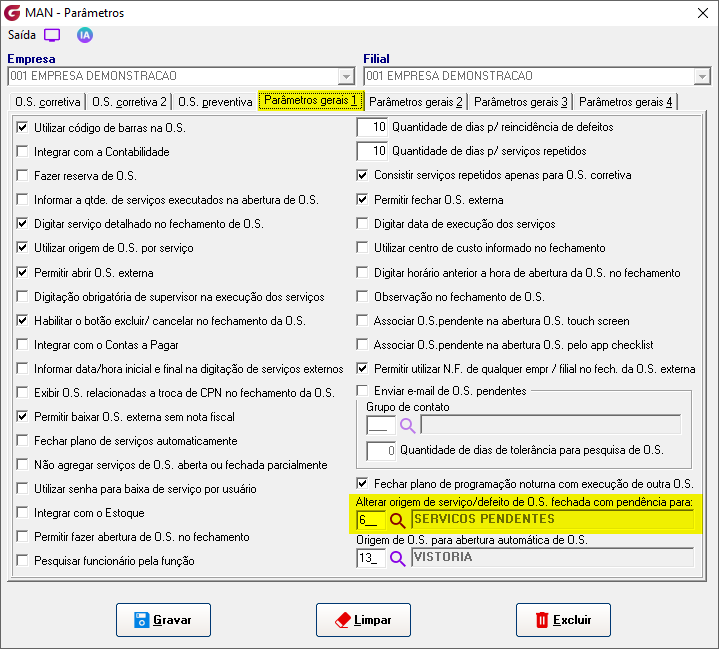 Implementado parâmetro para informar qual origem de serviço/defeito será atribuída a um defeito/serviço que não foi executado numa ordem de serviços fechada com pendência. Na tela de fechamento de ordem de serviço, quando fechar clicando no botão 'Fechar com pendência', altera a origem dos defeitos/serviços não executados para a origem informada no parâmetro. Parâmetros> Manutenção> Parâmetros gerais 1 ![]() Relatórios> Defeitos e serviços executados Os serviços/defeitos não executados em O.S. fechada com pendência, têm sua origem gravada com o código de origem informado no parâmetro.