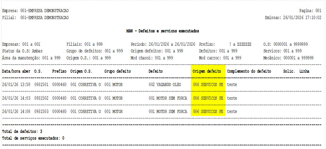 Caminho de acesso: >Parâmetros> Manutenção> Parâmetros gerais 1 >Relatórios> Defeitos e serviços executados |