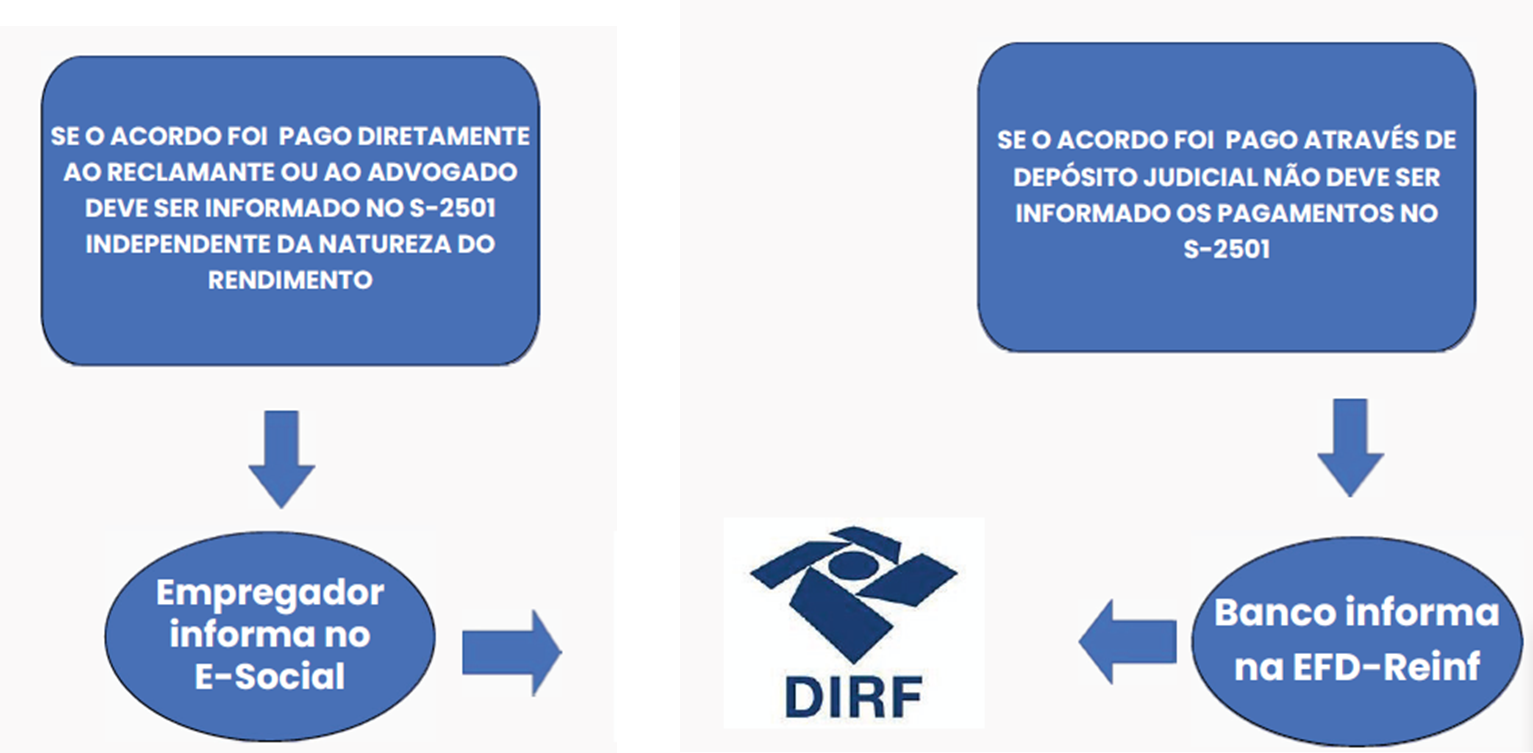 Deve ser enviados os dados de processos trabalhistas pagos diretamente ao reclamante ou aoadvogado. Os envios que alimentam a DIRF ocorrem através do evento S-2501.