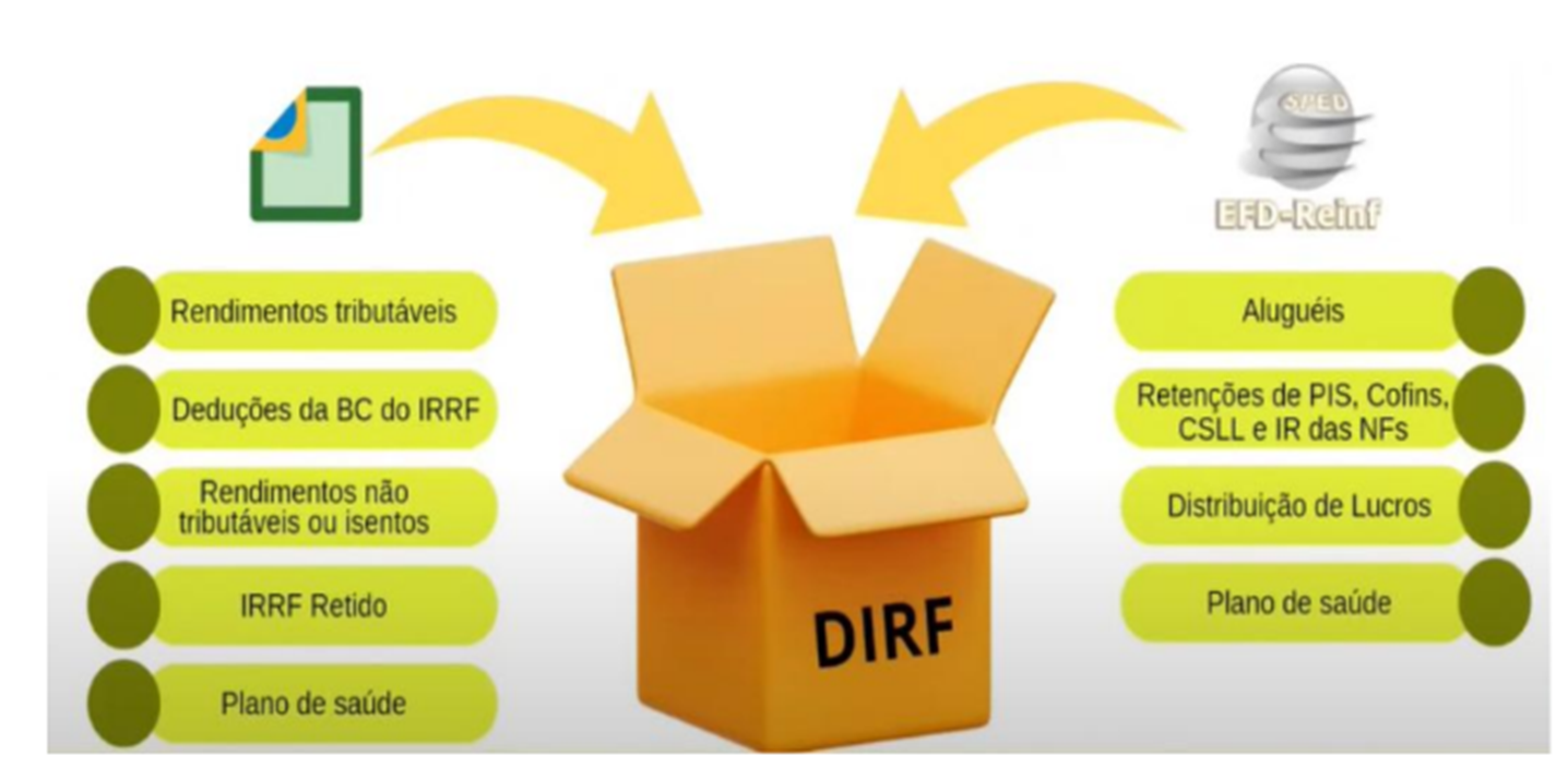 A REINF também envia para DIRF informações relativas aos eventos de Pagamentos e Retenções na fonte como: IR, CSLL, COFINS, PIS/PASEP.