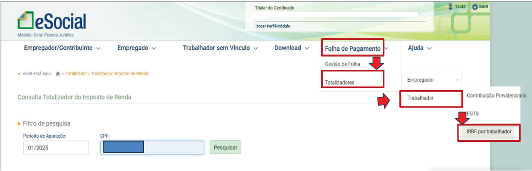 No site do eSocial, deve-se acesar Folha de Pagamento> Totalizadores> Trabalhador> IRRF por Trabalhador.
