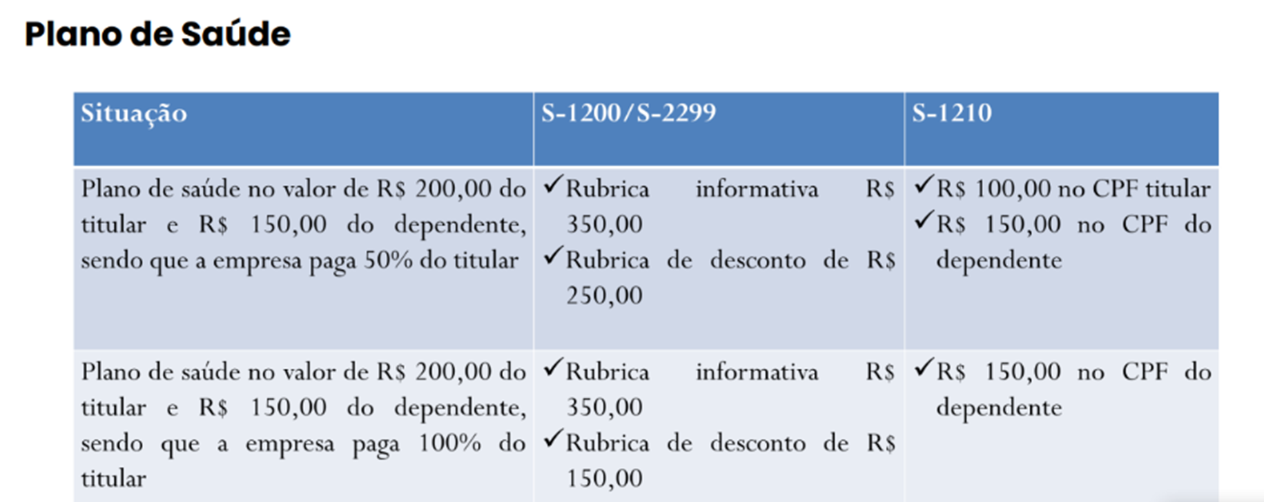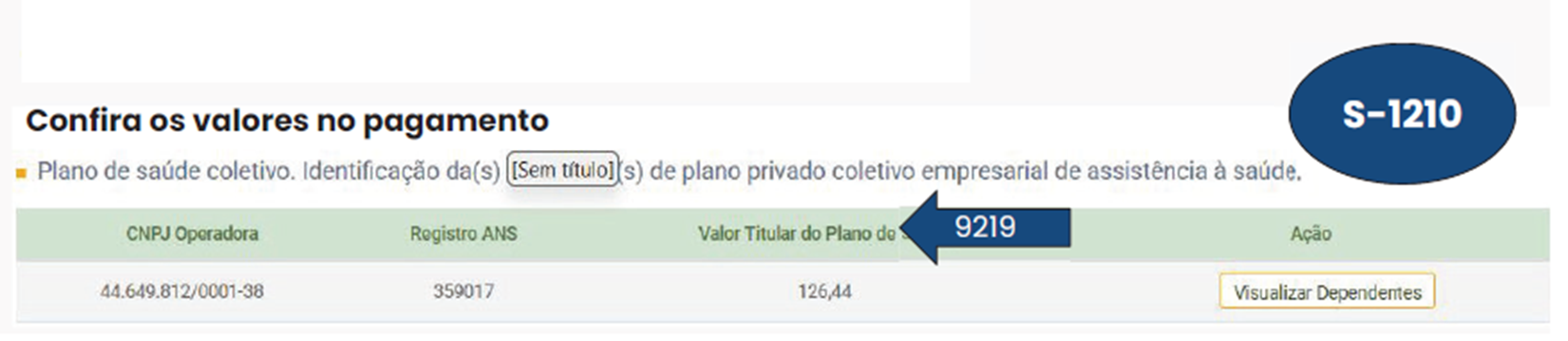 Conferência das informações de plano de saúde, sempre que utilizar a rubrica 9219 no evento, é informado no xml os dados de plano medico como: Cod. ANS, CNPJ da operadora, CPF do titular ou dependente e essas informações devem constar corretamente na S-1210.