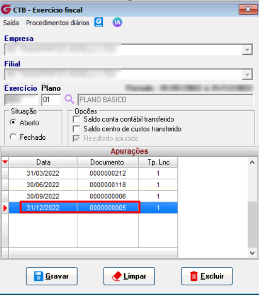 Informe Empresa e Filial, o exercício para o qual foi realizada a Apuração, e o plano de contas.
