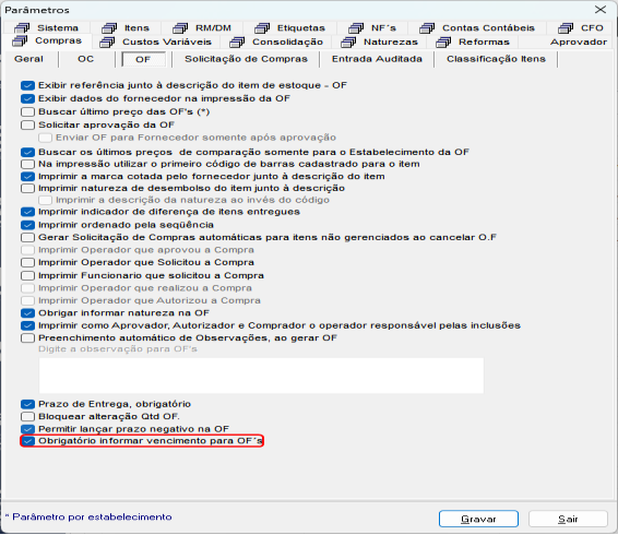 Parâmetro exigindo preenchimento de vencimentos para OF. |