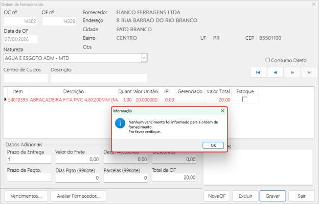 Ao tentar gravar a OF sem digitar os vencimentos ira apresentar a mensagem de aviso informando que não possui nenhum vencimento informado para a ordem de fornecimento.