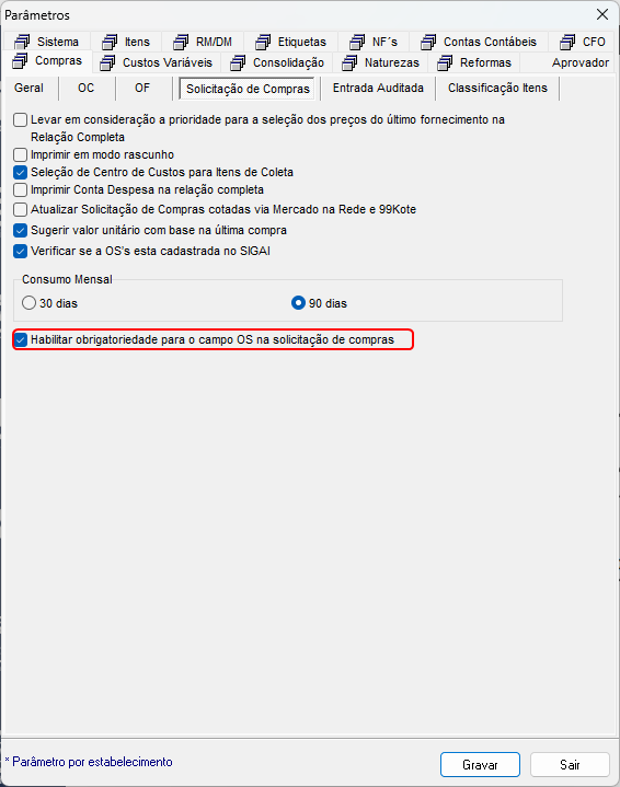 Foi criado o parâmetro “Habilitar obrigatoriedade para o campo OS na rotina de solicitação de compras”. Imagens meramente ilustrativas: