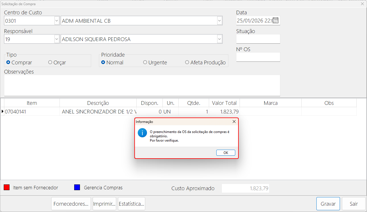 Com o parâmetro marcado, ao tentar realizar uma solicitação de compras com o campo OS em branco ira apresentar a seguinte mensagem.