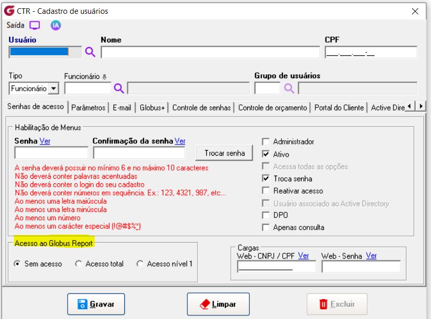OBS.: Caso seja necessário liberar o Globus Report, habilite o tipo de acesso na opção “Acesso ao Globus Report”.