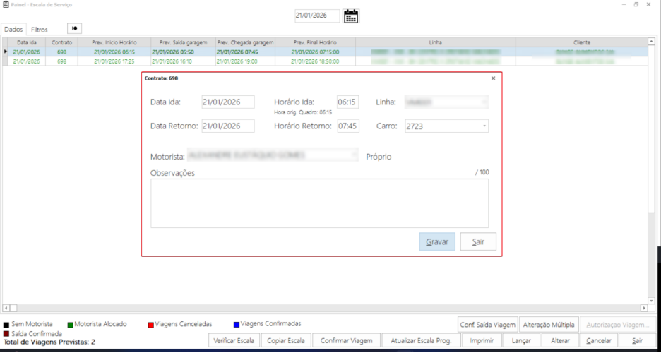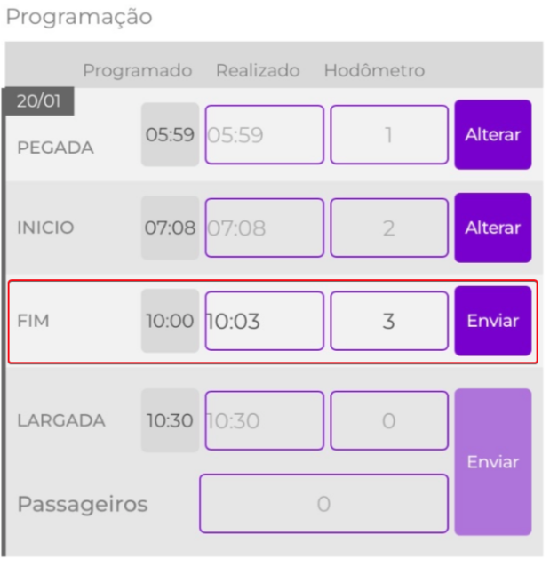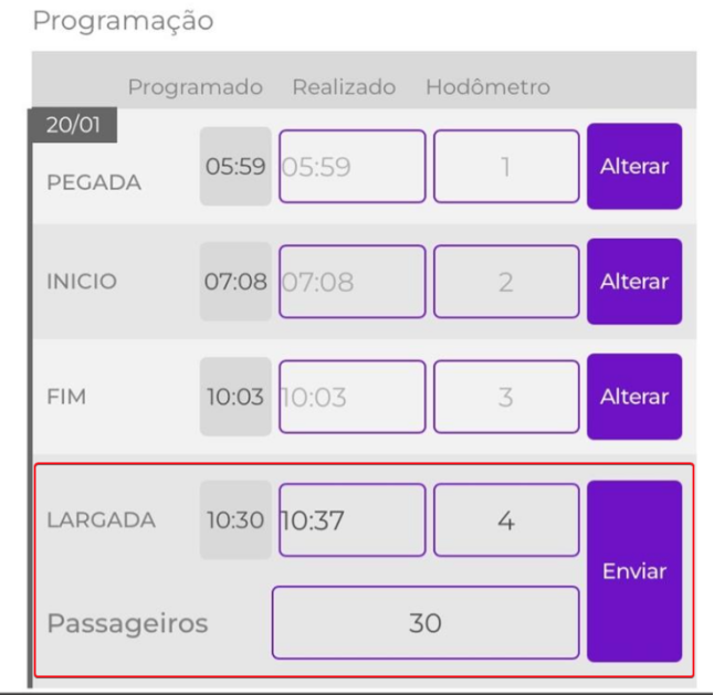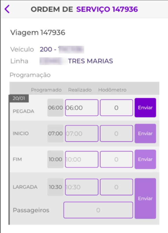 Dentro da viagem em si, o motorista irá visualizar os horários programados para ele e informar os horários que realmente ocorreram e KM, além da quantidade de passageiros: