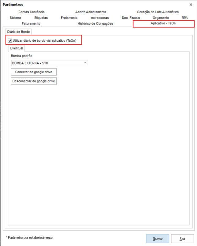 SigaFR [Caminho] ➪ Utilitários ➪ Parâmetros ➪ Aba: ‘Aplicativo - TaOn’ : ‘Utilizar diário de bordo via aplicativo (TaOn).