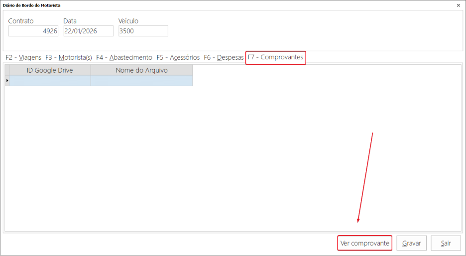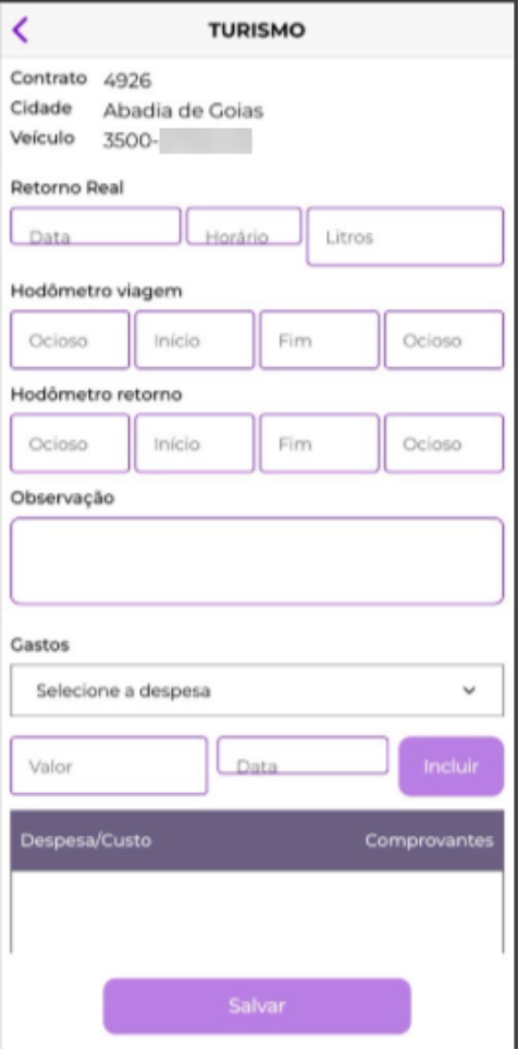 Dentro da viagem em si, o motorista poderá informar o horário de chegada a garagem, litros que abasteceu, hodômetros, observações, gastos e anexar imagens que serão arquivadas no Google Drive.
