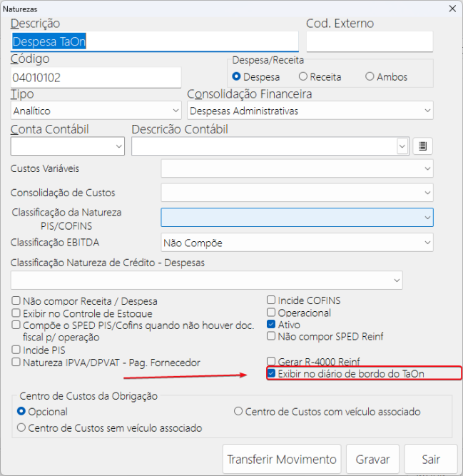 Importante: Para salvar as imagens enviadas, no parâmetro acima você deve se conectar ao seu Google Drive. Gastos: Para que seja possível informar gastos: Os gastos apresentados no TaOn nada mais são, do que as naturezas do modulo Controle Financeiro. Para que sejam exibidas no TaOn, elas devem ser de tipo Analítica, estar ativa, ser de despesa ou ambas e estar com a flag ‘Exibir no Diário de bordo do TaOn’ acionada.