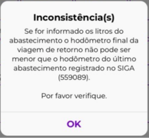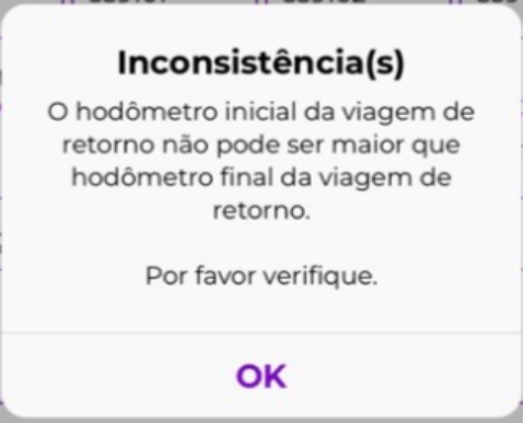 Durante o preenchimento das informações, os campos de KM possuem validações, onde o próximo informado não pode ser menor que o anterior, ao tentar salvar com inconsistências pode se deparar com avisos como: