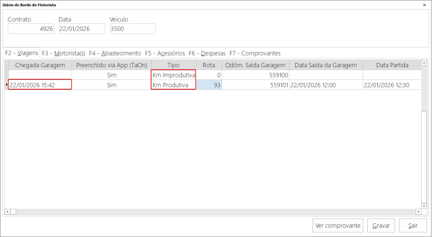 Após enviar as movimentações, não será possível fazer alterações pelo app Taon. Após o envio, dentro do SigaFR, no diário de bordo será possível visualizar as informações enviadas pelo motorista. Horário de chegada a garagem e hodômetros:
