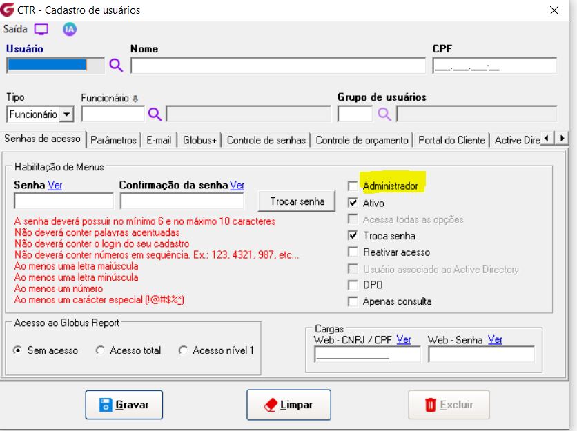 2 - Selecione o usuário desejado, marque a opção “Administrador” e clique em Gravar.