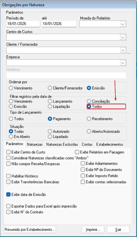 • Caminho de acesso:  Relatórios ➪ Relatórios Gerencias > Obrigações Por Natureza